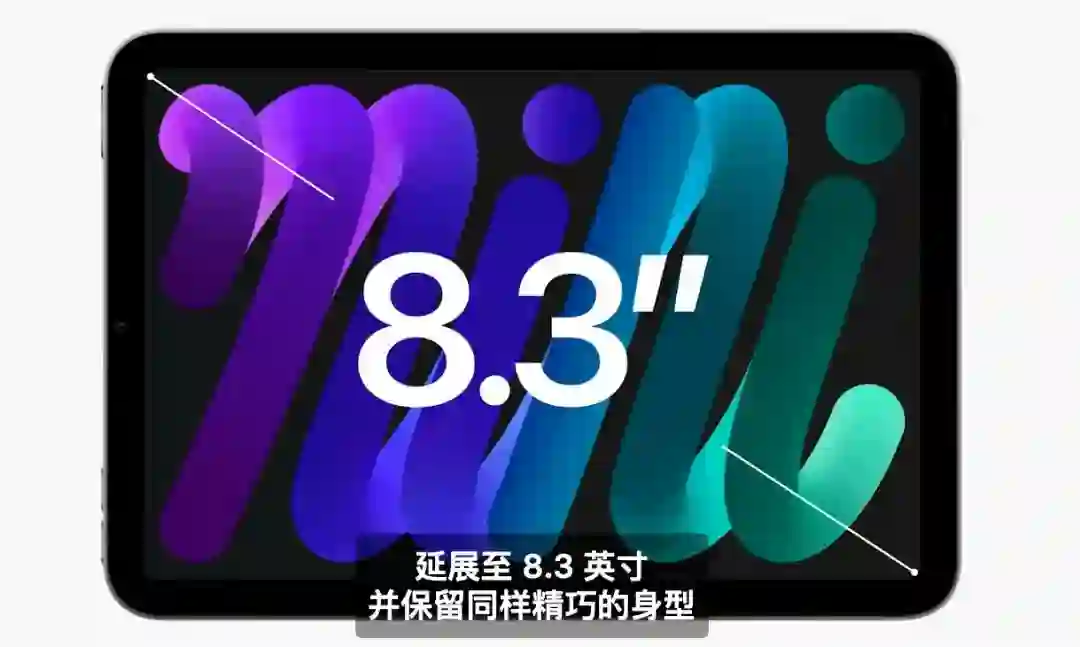 第六代 iPad mini 采用了全新的全面屏设计,摒弃了 Home 键,采用了 8.3 英寸 Liquid 视网膜显示屏。该显示屏支持广色域和原彩显示,拥有抗反射涂层,亮度达到 500 尼特。