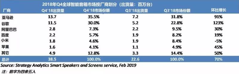 根据市场调研公司Strategy Analytics最新公布的全球智能音箱2018年Q4出货量报告,阿里、百度和小米已然跻身前五名。而分析近几期报告,国内智能音箱市场的几大巨头基本已经定格。这不得不归功于近一两年来的“价格战”。