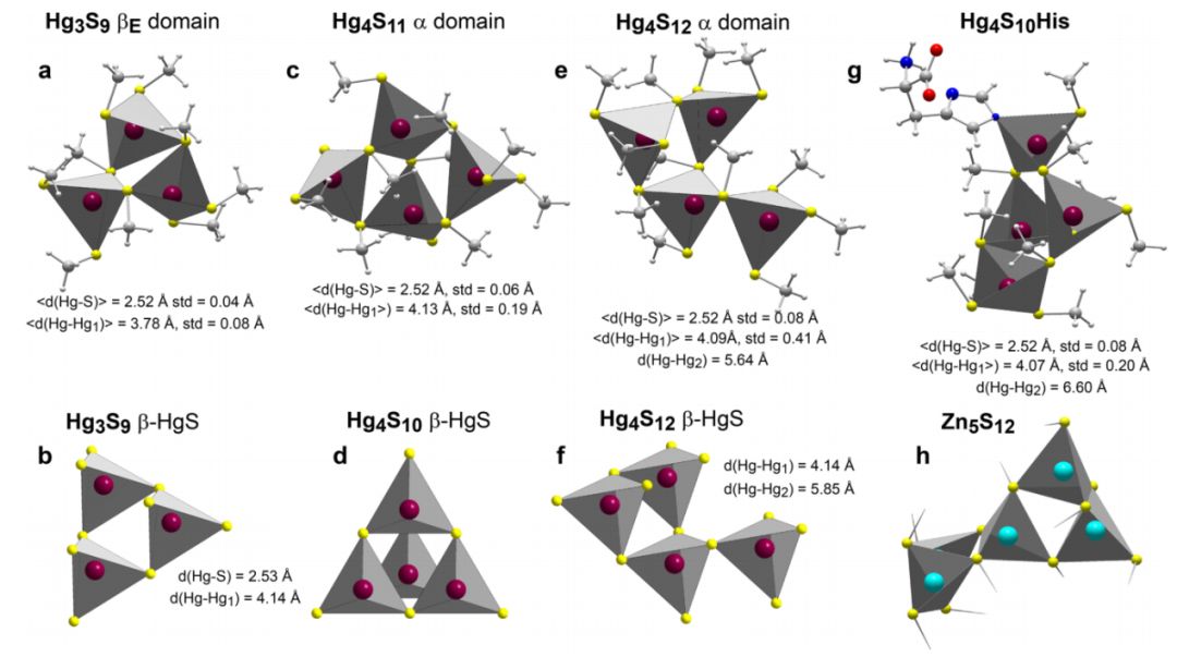 研究结果发现,在植物叶片中大部分汞以 Hg[(SR)2+N/O0-2] 的化学形态存在,部分汞以纳米颗粒态汞(HgxSy)的形态存在(图1)。通过二阶 Møller-Plesset 振动理论,利用计算机模拟了 HgxSy 的几何结构(图2)。本结果首次揭示了植物叶片可以将单质汞转化为惰性的纳米状硫化汞,这对深入了解叶片中汞的再挥发、毒性以及其进入土壤后的转化提供了基础理论知识,丰富了汞的生物地球循环理论。成果发表于环境科学领域期刊 Environ. Sci. Technol。