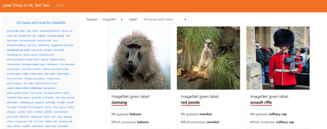 为了向所有人展示这些错误,帮助改进数据集,研究者还做了一个专门的归类网站。