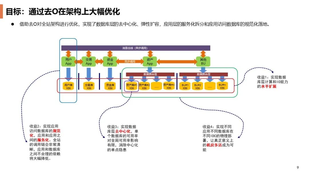 最后借助去 O 实现的分布式架构,可以把各个分片的数据库部署在不同的机房,从而实现真正意义上的机房多活。