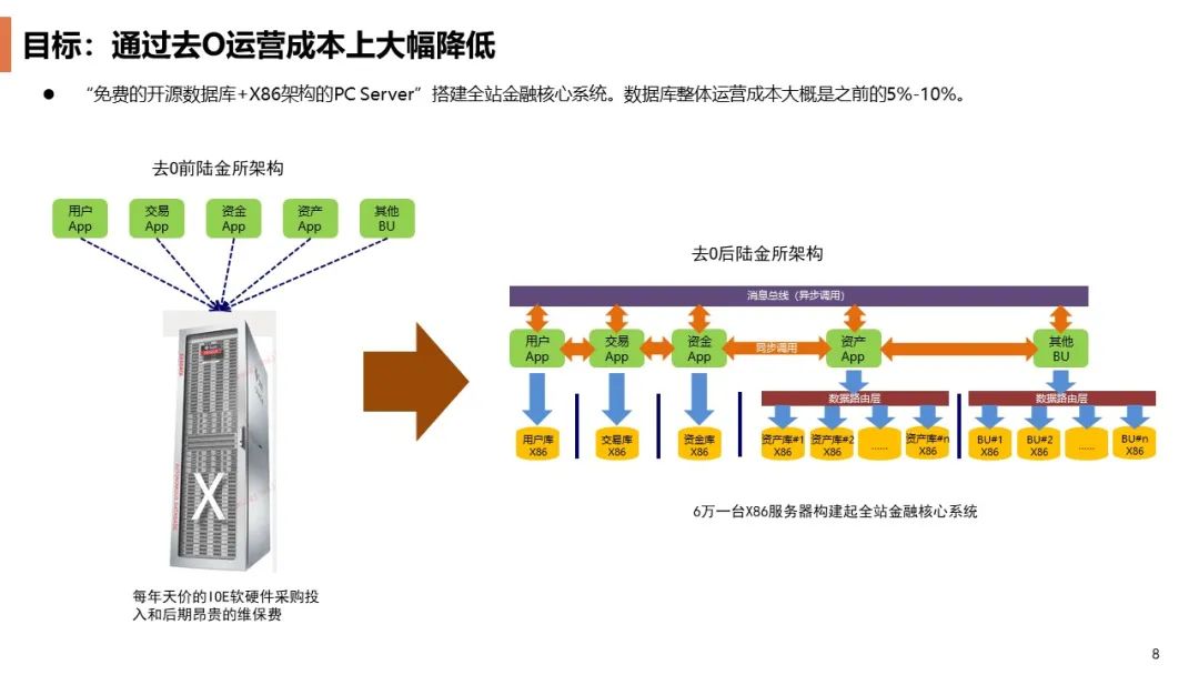 去 O 完成后,使用“免费的开源数据库 + X86 架构的 PC Server”来搭建金融核心系统,真的很省钱。因为搭建金融核心系统从昂贵的高端服务器、高端存储和 Oracle 一体机,以及昂贵的 Oracle 软件授权变成只需要 6 万一台的 X86 服务器,花在数据库上的运营成本降为之前的 10% 不到。