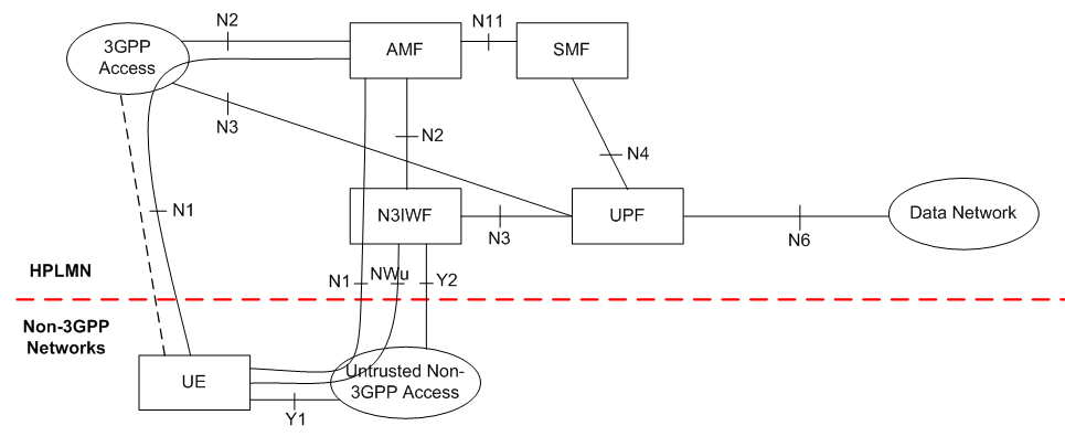 用户通过非3GPP网络(Wi-Fi)通过N3IWF接入5G核心网