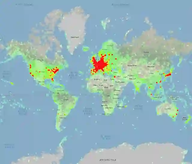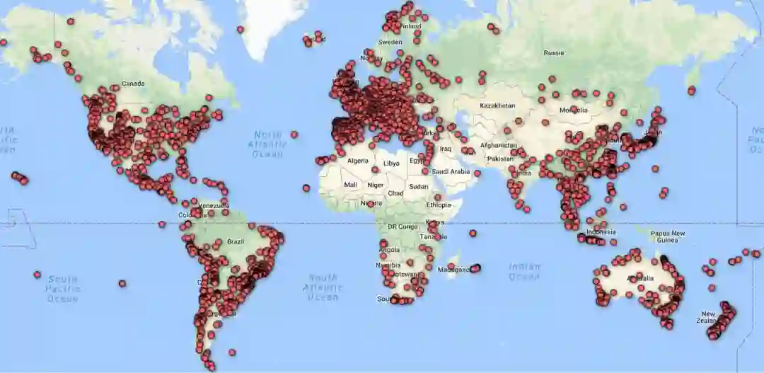 不到一年的时候,Google就开源了它的升级版:Google-Landmarks-v2。这是一个新的、拥有更大地标识别语料的库,包含的照片数量是初代的两倍、地标数据量是初代的七倍。从此,Google朝着更复杂的地标检测计算机视觉模型的目标迈出了重要的一步。下图为Google-Landmarks-v2中地标位置的热图👇