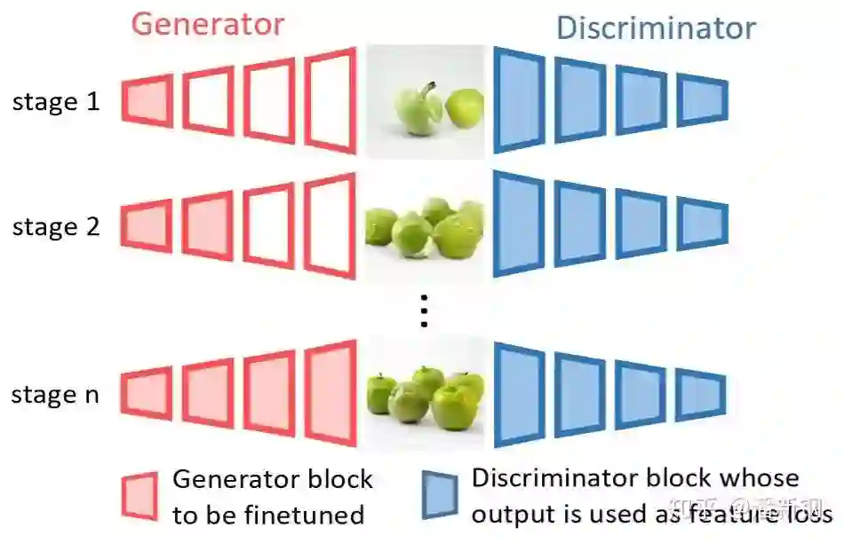 因此,我们在该工作中选择使用与该生成器对应的判别器来作为距离度量。与Perceptual loss所采用的VGGNet不同,判别器并非在一个第三方的任务上训练,而是在预训练时就与生成器高度耦合,它天然地适用于调整生成器的输出分布。我们用判别器特征空间的L1距离作为距离度量,即 ,其中