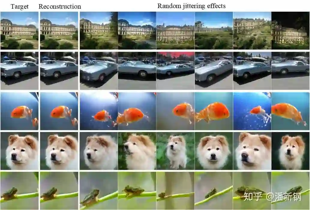例如,通过对隐向量z加随机高斯噪声,可以对目标图片实现随机扰动效果: