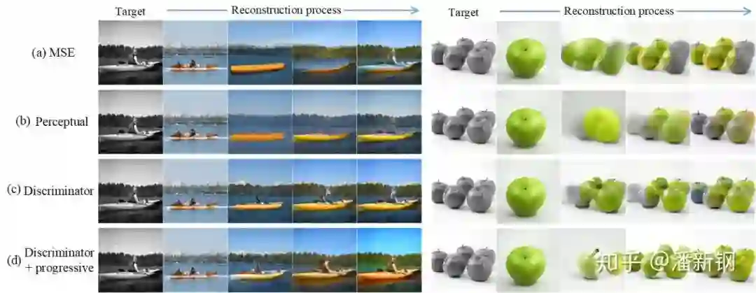 代表以x作为输入时判别器第i个block输出的特征。从上图(c)可以看出,使用这种基于判别器的距离度量时,重建的过程更加自然和真实,最终颜色恢复的效果也更好。