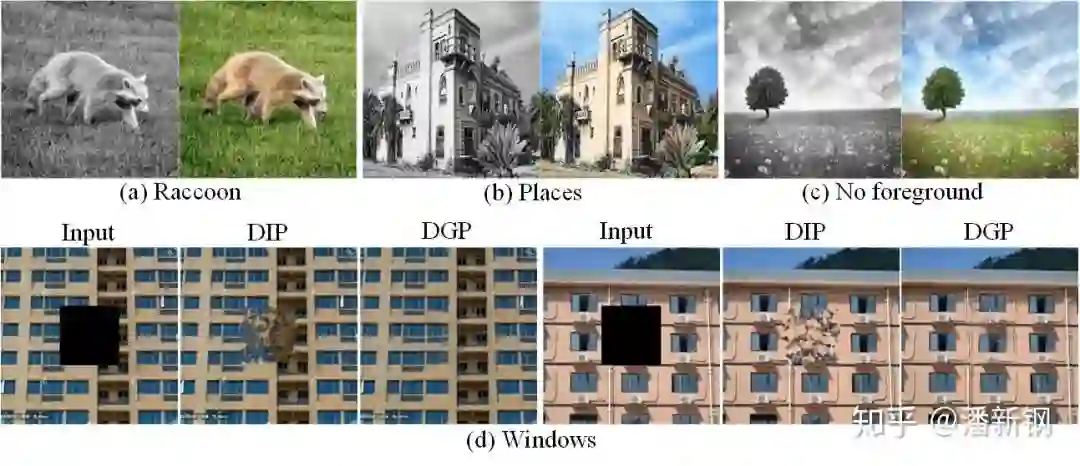 这里(d)中两个楼房的例子很有意思,图中需要恢复部分的信息(横梁,窗户)在周围仅出现了4或8次,而生成器就能在重建的过程中“学过来”,利用周围像素信息填补缺失部分。可见相比较DIP,DGP更好地模拟了像素间的空间关系。