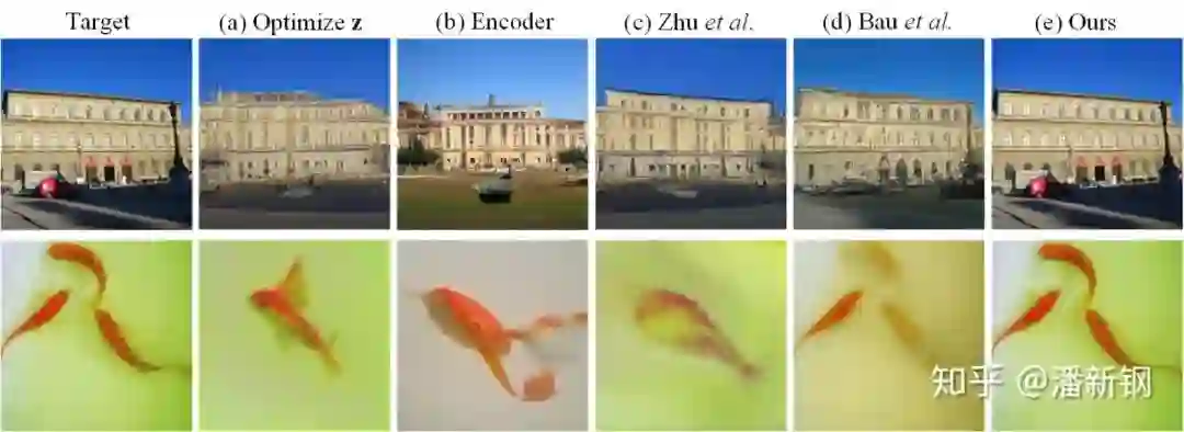 这种解放生成器的做法其实沿袭了DIP的思路。生成器仅需要微调,就可以实现对目标图片的精确重建,如上图中的(e)。