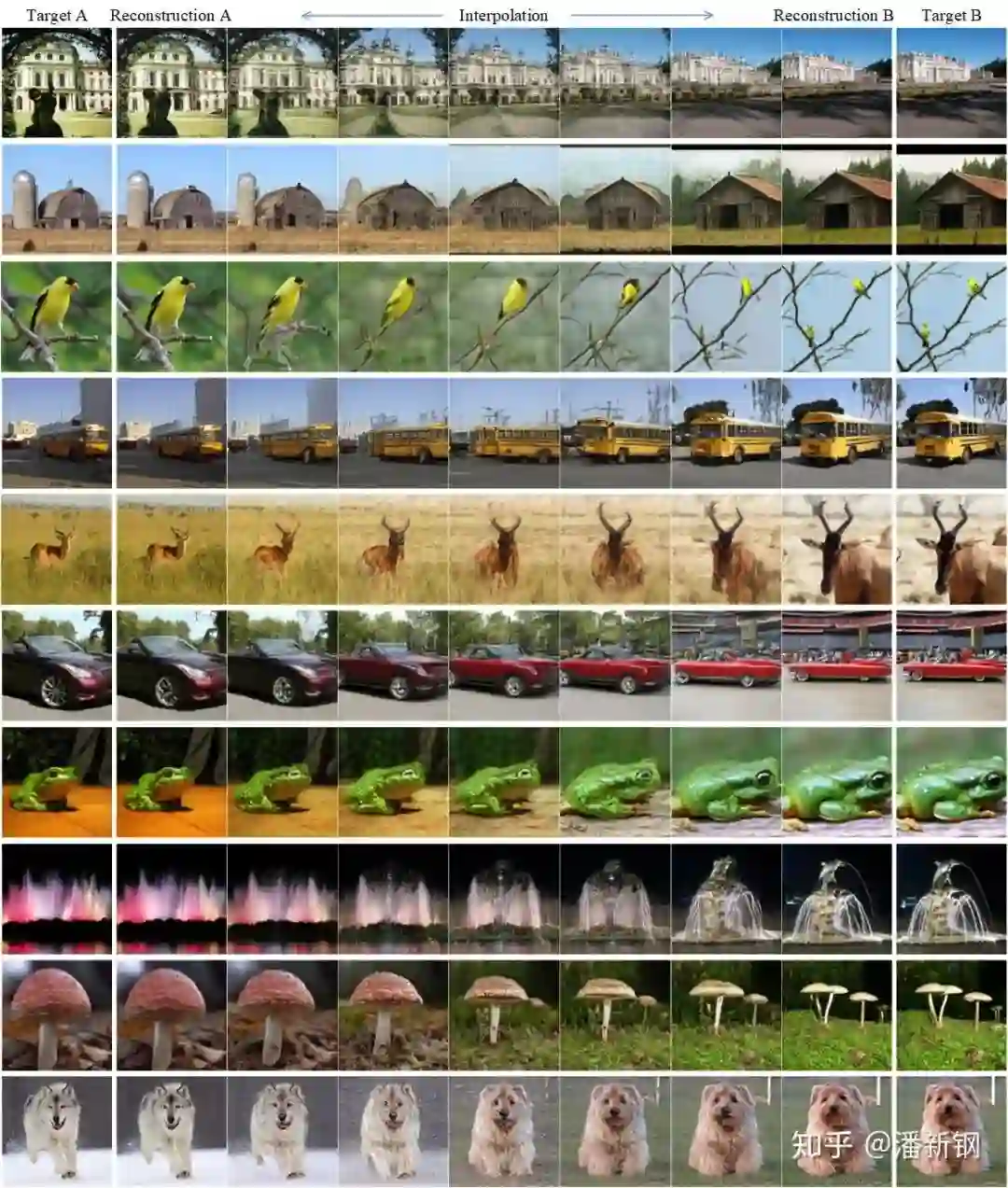 对重建两张图片得到的隐向量和生成器参数进行插值,可以实现图像渐变效果: