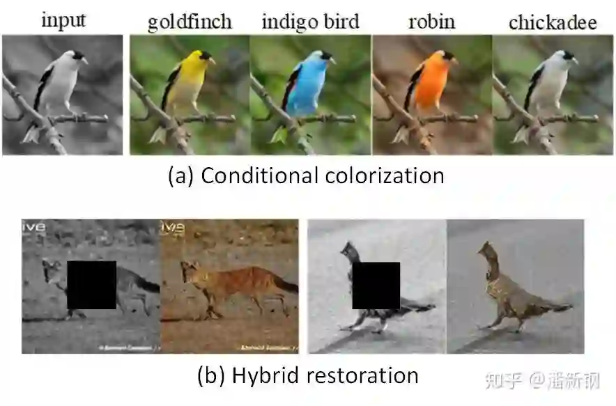 此外,DGP可以有更加灵活的应用,例如下图中的条件上色和混合复原。条件上色即在灰度空间重建时对生成器输入不同的类别条件,最终恢复的颜色会呈现出不同的效果。混合复原即同时进行多种图像复原任务,例如下图(b)中同时进行上色,补全,和超分辨率(两倍放大)。