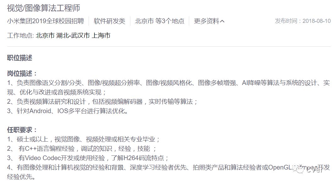 Amusi 这么中意CV,当然投递是这个方向。小米家提供的相关岗位称为视觉/图像算法工程师。