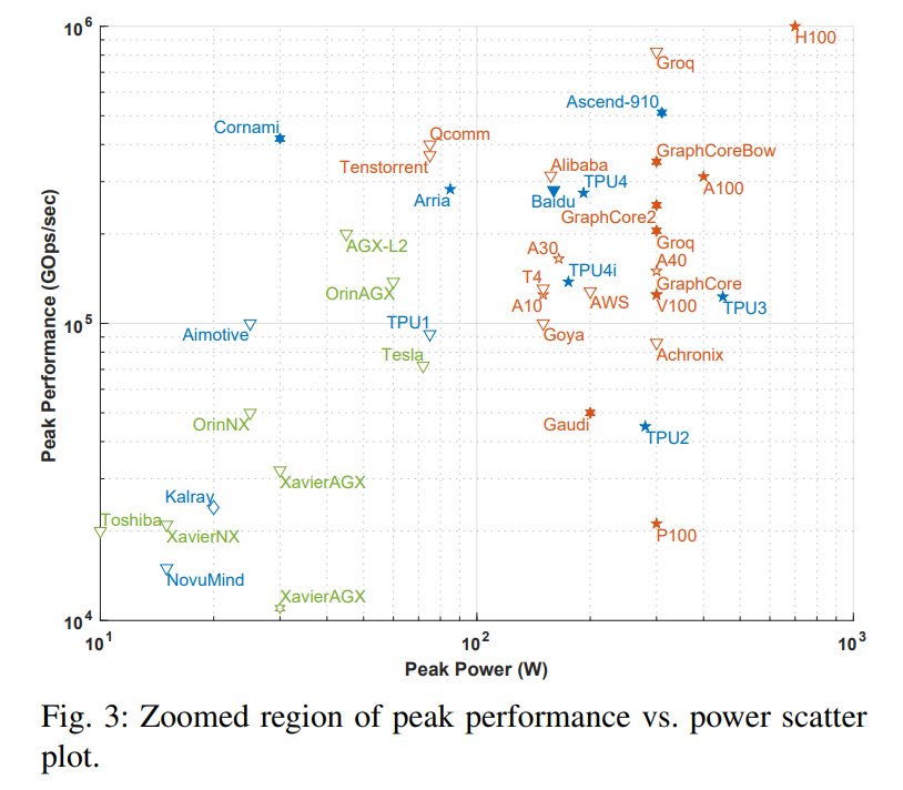 图中 x 轴表示峰值功率,y 轴表示每秒峰值千兆操作数(GOps/s),均为对数尺度。处理能力的计算精度用不同几何形状表示,计算精度范围从 int1 到 int32、从 fp16 到 fp64。显示的精度有两种类型,左边代表乘法运算的精度,右边代表累加 / 加运算的精度(如 fp16.32 表示 fp16 乘法和 fp32 累加 / 加)。使用颜色和形状区分不同类型系统和峰值功率。蓝色表示单芯片;橙色表示卡;绿色表示整体系统(单节点桌面和服务器系统)。此次调查仅限于单主板、单内存系统。图中空心几何图形是仅进行推理加速器的最高性能,而实心几何图形代表执行训练和推理的加速器的性能。