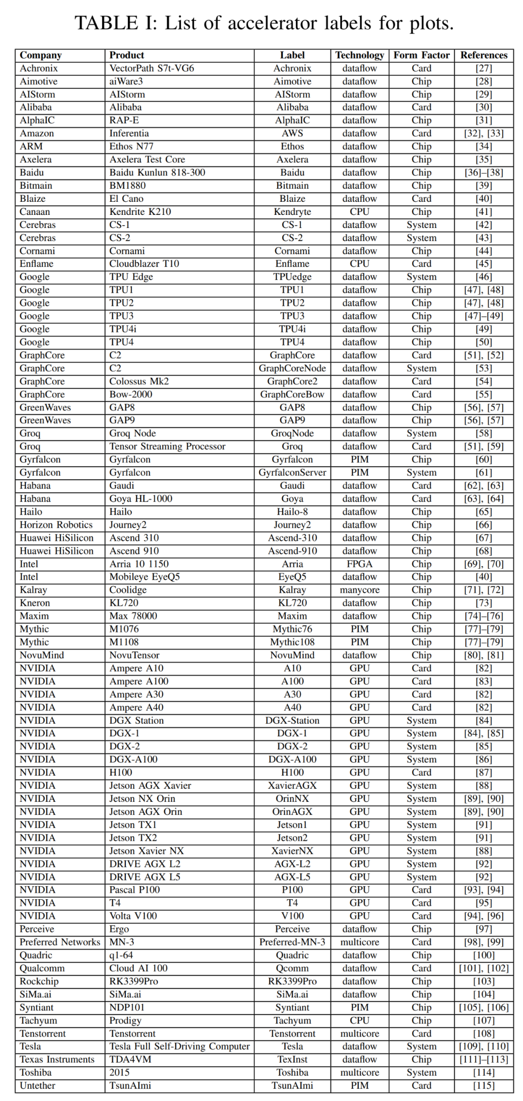 本文是对 IEEE-HPEC 过去三年论文的一次更新。与过去几年一样,本文继续关注深度神经网络(DNN)和卷积神经网络(CNN)的加速器和处理器,它们的计算量极大。本文主要针对加速器和处理器在推理方面的发展,因为很多 AI/ML 边缘应用极度依赖推理。本文针对加速器支持的所有数字精度类型,但对于大多数加速器来说,它们的最佳推理性能是 int8 或 fp16/bf16(IEEE 16 位浮点或 Google 的 16 位 brain float)。