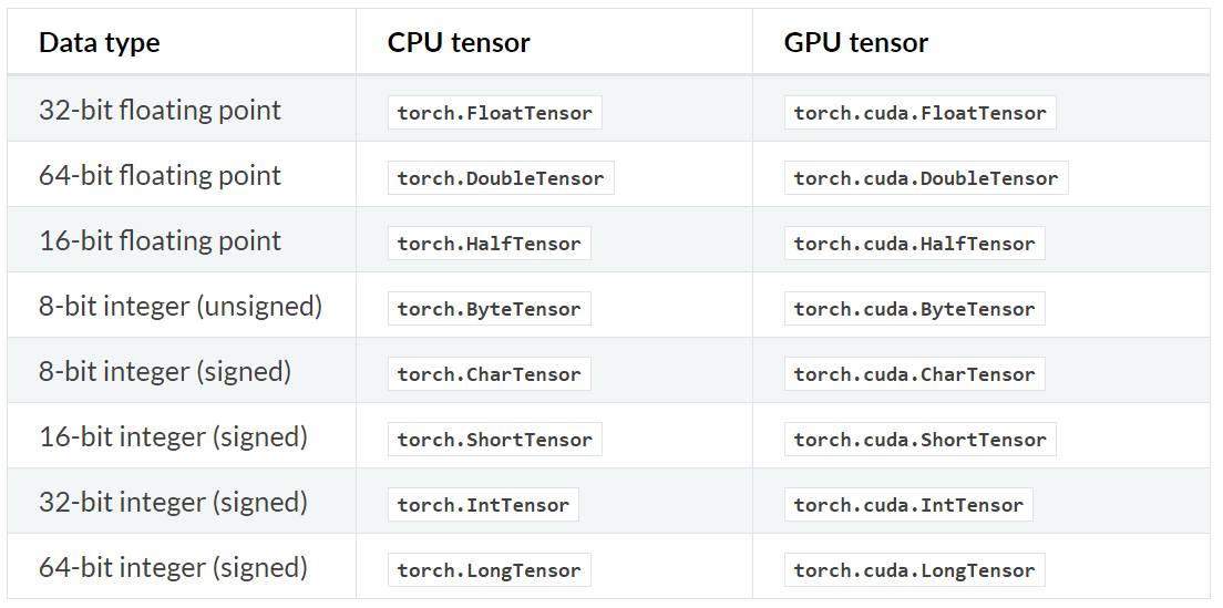在 PyTorch 中,torch.Tensor 是一种多维矩阵,其中每个元素都是一个单一的数据类型,且该构造函数默认的为 torch.FloatTensor。以下是具体张量的类型: