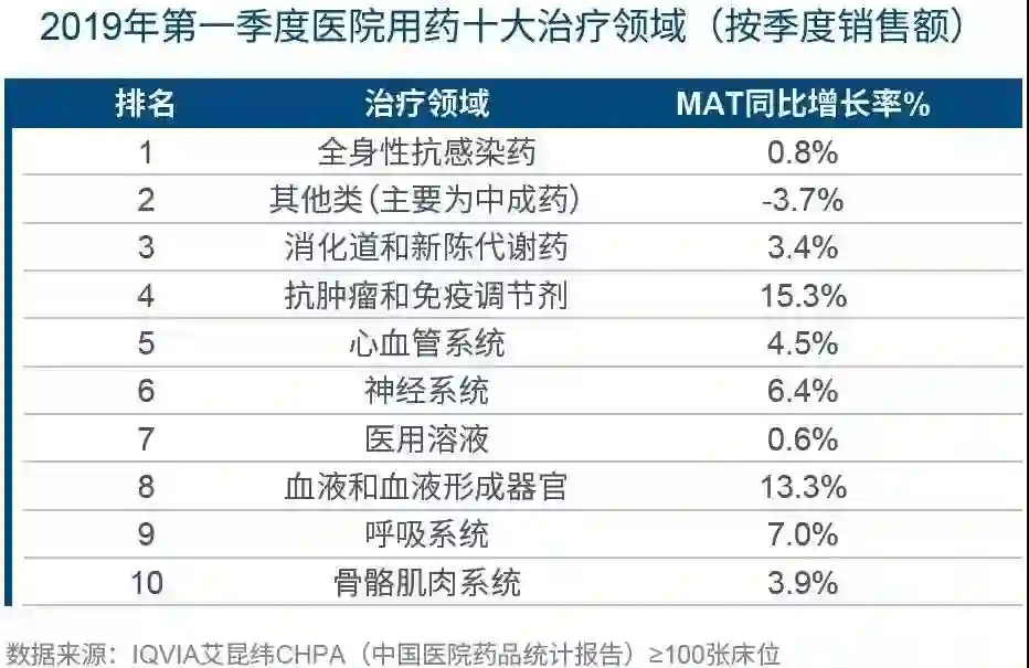 抗肿瘤药和免疫调节剂的 MAT 年销售额同比增长 15.3%,增速位列所有品类第一。此外,血液和血液形成器官用药的增速也远高于整体市场。