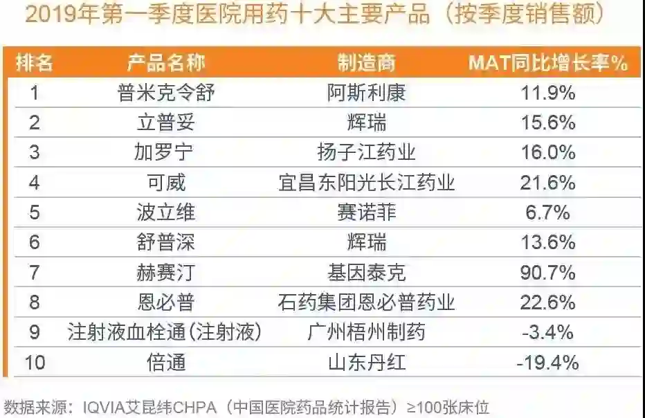 从产品的季度销售额来看,阿斯利康的普米克令舒重回第一,辉瑞的立普妥和扬子江药业的加罗宁分列第二、第三位。从 MAT 同比增长率看,赫赛汀同比增长率最高,达到 90.7%,恩必普、可威的增长率也均超过 20%,高于 Top 10 的其他产品。