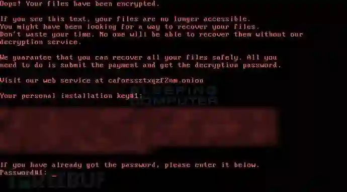 cscc.dat driver 和 dispci.exe 用来加密硬盘和修改 MBR,在受害者打开电脑的时候,就可以看到勒索提示信息了。