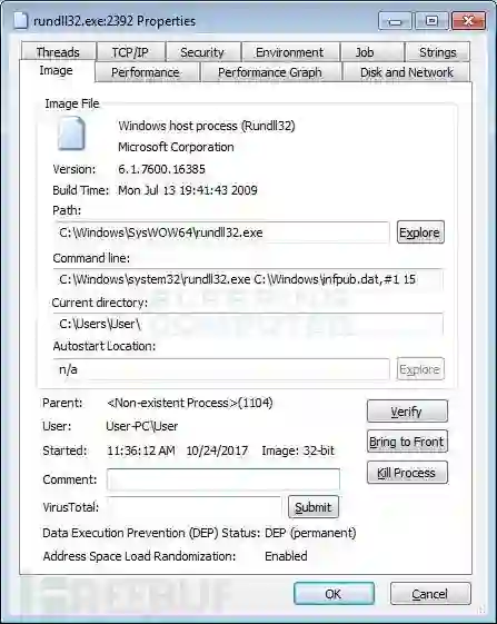 当执行完这个程序之后,它会生成一个文件 C:\Windows\infpub.dat,并使用命令行执行 C:\Windows\system32\rundll32.exe C:\Windows\infpub.dat, #1 15。