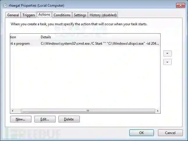 当电脑中出现用户记录时,Infpub.dat 还会创建一个 task 来执行 dispci.exe,名为 Rhaegal,也是《权力的游戏》里面的角色。这个 exe 会执行命令: “C:\Windows\dispci.exe” -id [id] && exit。