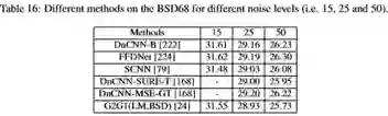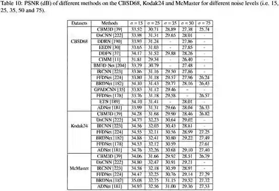 单一的end-to-end的CNN和CNN和先验知识的结合。对于第一类,设计网络结构对处理真实噪声图像是流行的。把多尺度、Skip connection、batch renormalization、dilated convolutions、attention mechanism融合到CNN中都能有效处理真实噪声图像。这些方法的详细信息被展示在表4: