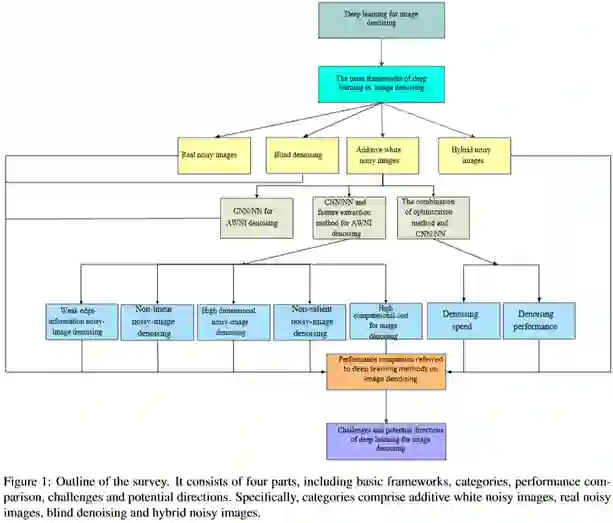 在本文我们对不同去噪网络进行全面地研究和系统地总结。首先,我们展示图像去噪的深度学习的基本框架。然后,给出不同去噪任务(如:外加白噪声、盲噪声、真实噪声和混合噪声的图像)的深度学习技术。接着,我们针对不同任务分析去噪网络的动机和理论。最后,我们比较了不同方法的去噪结果、效率和可视化效果。此外,我们也指出深度学习技术在图像去噪的潜在研究点和挑战。