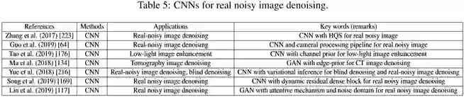 对于high dimensional noisy images来说,CNN和降维方法的组合是常用的去噪方法。对于non-salient noisy images来说,信号处理方法能引导CNN来提取显著的特征。对于high computational cost, CNN和图像的属性结合能有效地降低复杂度。上述所涉及方法的更多信息被展示在表2。