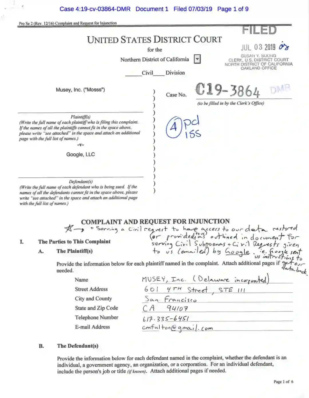 在向加利福尼亚州奥克兰美国地方法院提交的自己代表自己的诉讼「1」中,Mosss以之前的公司名Musey的名义要求谷歌帮助它恢复数据。