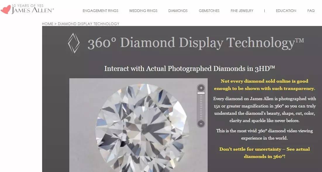 这些对手包括蓝色尼罗河公司(Blue Nile Inc.)和JamesAllen.com,后者为购物者提供了一个虚拟的戒指圈号量度工具、360度赏石视图,以及一个旨在帮助客户为自己设计戒指的界面。