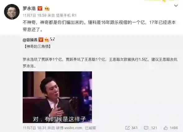 【罗永浩:锤科跟乐视借的一个亿,17年已经连本带息还了】近日,贾跃亭、罗永浩、王思聪三人因“老赖”标签轮番成为舆论焦点(后两者已辟谣不是老赖),除了被贴上相同的标签,有网友甚至脑洞大开发现了这三人之间的又一关联,罗永浩、贾跃亭、王思聪竟然可以组成“神奇的三角债”——“罗永浩坑了贾跃亭1个亿,贾跃亭坑了王思聪1个亿,王思聪欠款被执行1.5亿”,于是网友建议王思聪去坑罗永浩。罗永浩转发微博称:“锤科是16年跟乐视借的一个亿,17年已经连本带息还了。”(Techweb)