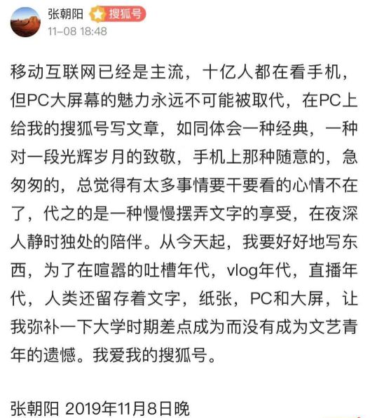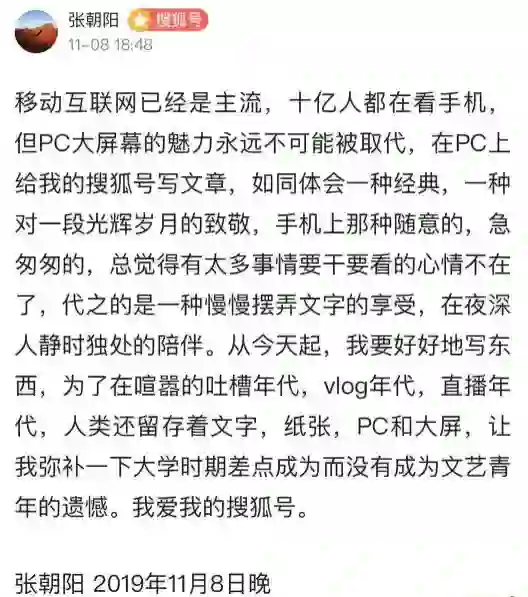 【张朝阳:将从今天起好好地写东西,PC大屏幕的魅力永不会被取代】11月8日晚间,搜狐公司董事局主席兼CEO张朝阳发文称自己将从今天起好好地写东西。他表示,移动互联网虽然已成主流,但PC大屏幕的魅力永远不可能被取代。张朝阳还称要弥补一下大学时期没有成为文艺青年的遗憾。