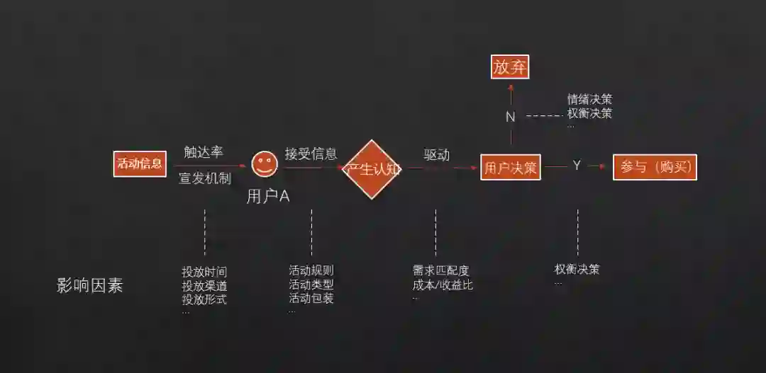例如商家的活动未有效传达给用户(触达);在用户看来,这个活动规则模糊不清,直接影响用户认知;形成认知后,和我关联性不强,或者太费劲(成本/收益比低、需求不匹配),导致直接放弃(决策)等等都是活动转化率低下的原因。
