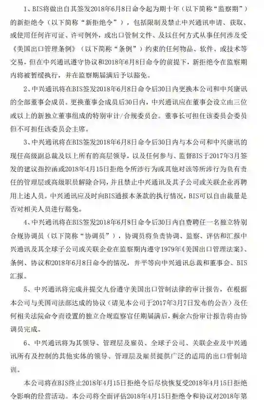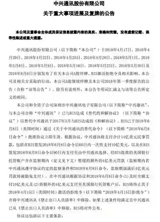 中兴通讯昨日复牌,全天封死跌停,截至收盘,股价报28.18元,跌3.13元,一天总市值蒸发131亿元。中兴通讯H股同步暴跌,截至目前跌幅为40%。6月12日晚间,中兴通讯发布公告称,该公司A股将于2018年6月13日上午开市起复牌。公告还确认,根据协议,中兴通讯将支付合计14亿美元(约合人民币89亿元)民事罚款,并在BIS命令签署后30日内更换公司和中兴康讯的全部董事会成员。