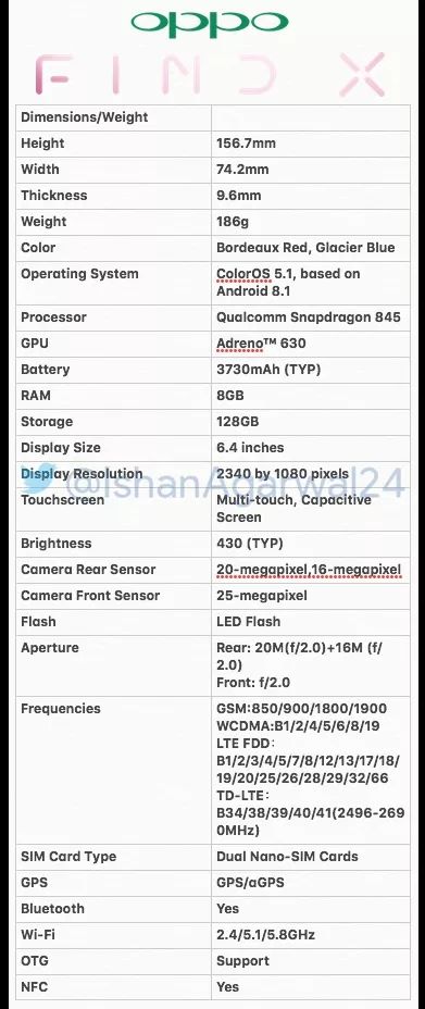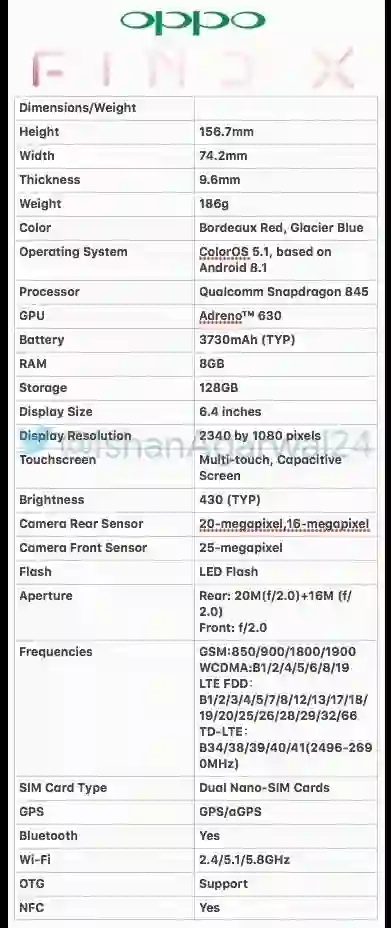 6月13日,GizChina.it放出了OPPO Find X的详细规格。具体来说,OPPO Find X采用了6.4英寸2340×1080显示屏搭载高通骁龙845处理器,配备8GB内存+128存储(另外提供8GB+256GB版本),电池容量为3730mAh。