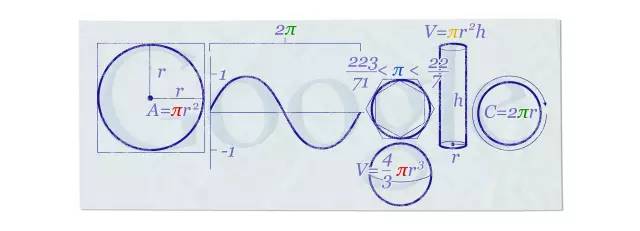 在2010年的圆周率日,谷歌推出了π的Google Doodle,图中包含了π的定义、π值范围、圆周长公式与圆面积公式、圆内切以及外切多边形、球体积公式、圆柱体积公式。。。
