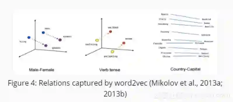虽然这些嵌入在概念上与使用前馈神经网络学习的嵌入技术没有什么不同,但是对非常大的语料库的训练使它们能够捕获诸如性别,动词时态和国家–首都关系之类的词之间的某些关系,由图4可知: