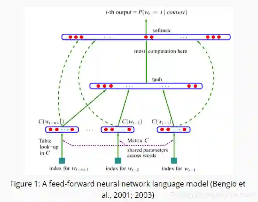 语言建模是在给定前面的单词的情况下预测文本中的下一个单词的任务。 它可能是最简单的语言处理任务,具有实际应用,如智能键盘和电子邮件响应建议(Kannan et al.,2016)。语言建模有着丰富的历史。基于n-gram的经典方法采用平滑处理看不见的n-gram(Kneser&Ney,1995)。Bengio等人于2001年提出了第一种神经语言模型,一种前馈神经网络,如下图1所示。