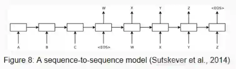 2014年,Sutskever等人提出序列到序列学习,一种通过神经网络将一个序列映射到另一个序列的通用框架。在该框架中,编码器神经网络逐个符号地处理句子并将其压缩成矢量表示; 然后,解码器神经网络基于编码器状态逐个符号地预测输出符号,在每个步骤中将先前预测的符号作为输入,如下面的图8所示。