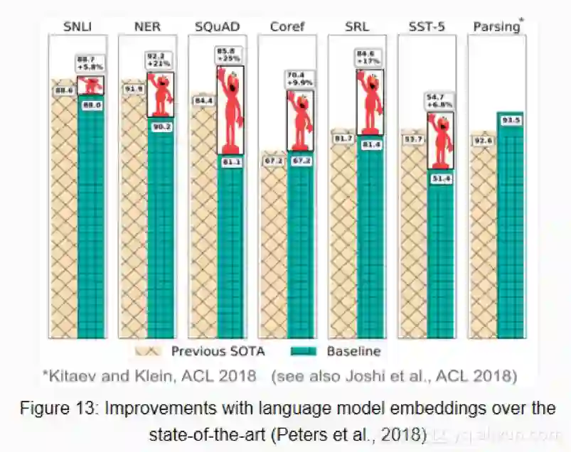 预训练的词嵌入与上下文无关,而且仅用于初始化模型中的第一层。最近几个月,一系列监督任务被用于预训练神经网络(Conneau等,2017; McCann等,2017; Subramanian等,2018)。相比之下,语言模型只需要未标记的文本; 因此,训练可以扩展到数十亿个tokens,新领域和新语言。 2015年首次提出了预训练语言模型(Dai&Le,2015); 直到最近,它们才被证明对各种各样的任务都有益。 语言模型嵌入可以用作目标模型中的特征(Peters等,2018),或者可以对目标任务数据微调语言模型(Ramachandran等,2017; Howard&Ruder,2018)。添加语言模型嵌入比许多任务的最新技术有了很大的改进,如下面的图13所示。