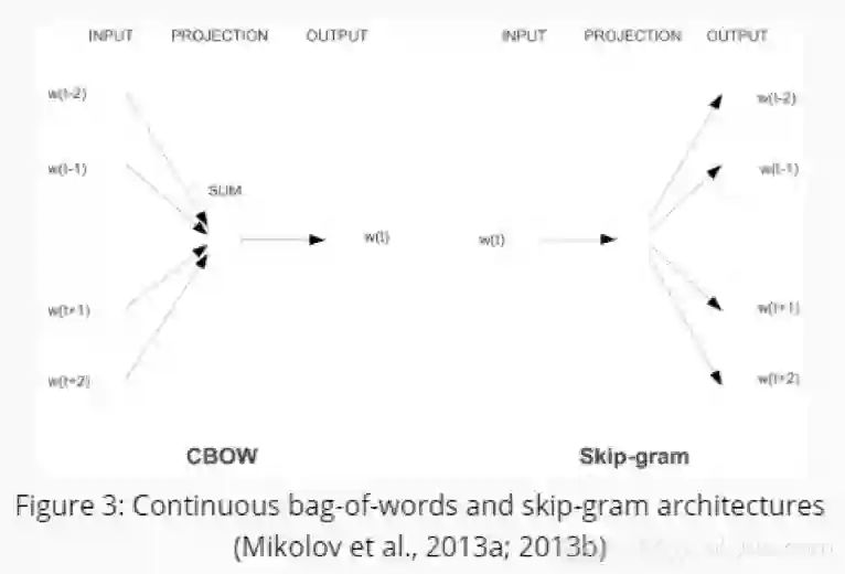 Word2vec有两种模式,可以在下面的图3中看到:连续的词袋(CBOW)和skip-gram。它们的目标不同:一个基于周围的词预测中心词,而另一个则相反。