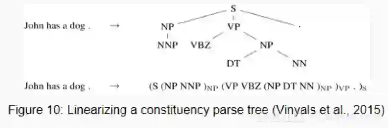 序列到序列学习甚至可以应用于NLP中常见的结构化预测任务,其中NLP输出具有特定结构。简单地说,输出是线性化的,如下面图10中的consituency解析所示。神经网络已经证明了在给予consituency解析的足够数量的训练数据(Vinyals等,2015)和命名实体识别(Gillick等,2016)等的情况下,能够直接学习产生这种线性化输出的能力。