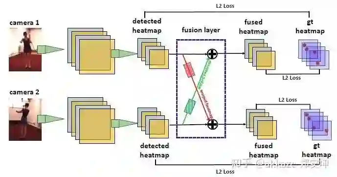 这是一个非常好的架构,直接把2d提升到了3d,可能被用在多视角的各个领域,包括三维重建,并且最后的结果可以投影回原视角,做自监督,缺点可能是计算量会比较大。 msra的一篇论文cross view fusion of human pose也很惊艳,使用epipolar几何来融合不同视角的2d heatmap达到互相改进的效果,个人感觉这一点不止可以用在landmark上(凡是使用了heatmap的地方都可以考虑用这种方式fuse,其实不止如此,,这个方法会把一个视图里的极限上所有的heatmap值通过一个权重矩阵w加权相加到另一个视图的极线上的点,而这个矩阵本质上是全局的,可能只和对极几何相关,它是否能被用来fuse featuremap个人感觉是非常有意思的一件事,但是这个计算量应该会很大)。