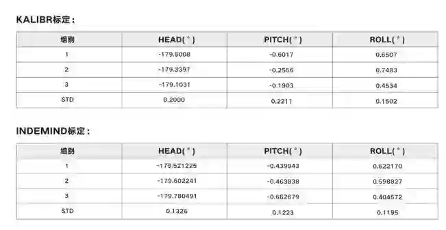 INDEMIND双目惯性模组采用的标定方法是其自行设计的,与开源Kalibr标定相比,相机与IMU间的安装角误差重复性精度提升1.5倍,相机重投影误差降低0.04个像素(平均值)。