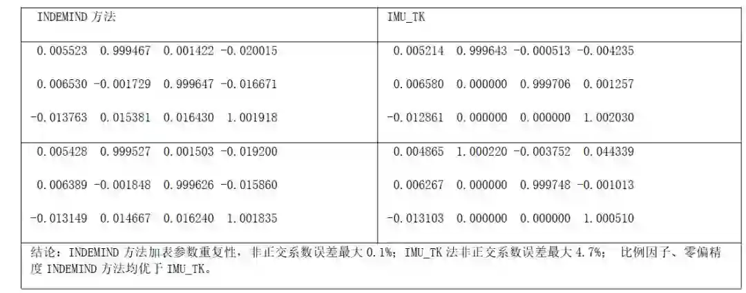 与IMU_TK对比,INDEMIND标定的加速度计和陀螺仪在零偏、比例因子及正交误差参数方面均有明显提升,通过加速度计参数重复性,加速度计静态测量结果与重力绝对偏差,陀螺参数重复性、静态陀螺零偏偏差、动态陀螺旋转位置角度等方面验证了标定结果均优于IMU tk方法。