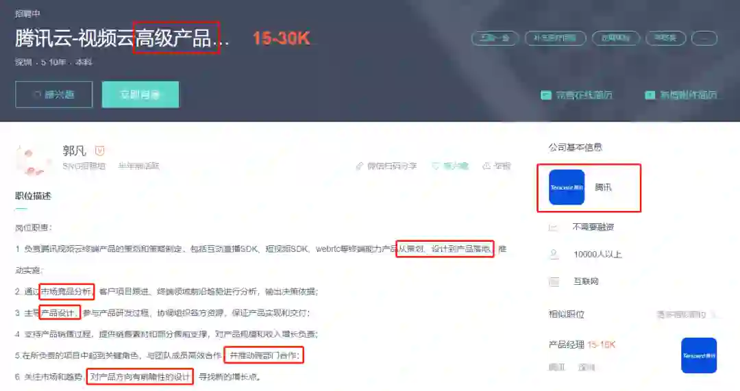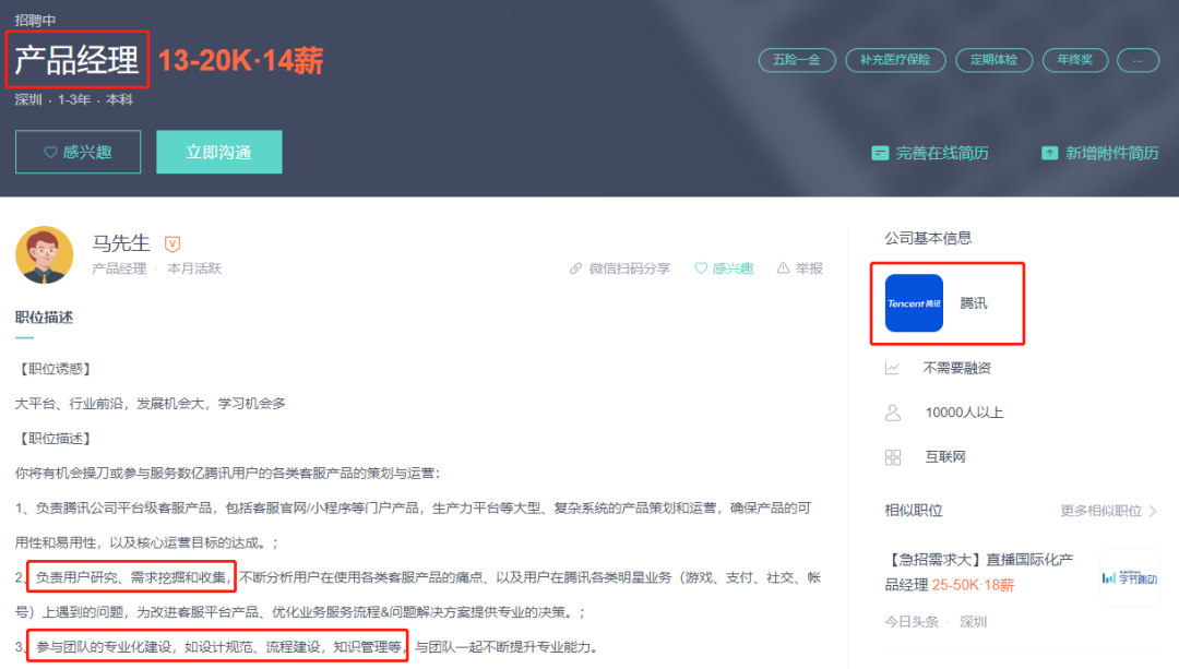 从腾讯产品经理岗位JD也可以清晰看到,大厂产品经理需要具备市场分析、竞品分析、产品设计、用户研究等能力。
