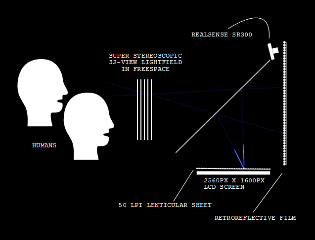 HoloPlayer One系统的核心是一个液晶显示屏,可以同时向特定的场景发送32个视图。这就创造了一个“光场”,构建一个场景。然后将光场回射,在HoloPlayer One之外形成一个真实的图像,让场景呈现在半空中。
