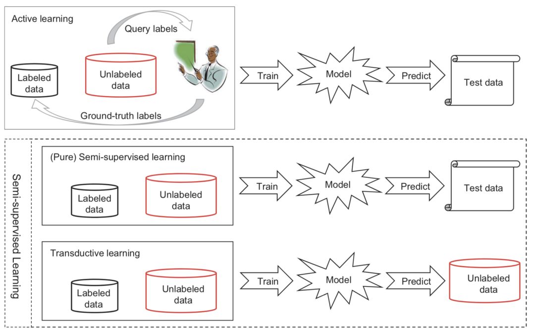 图 2:主动学习、(纯)半监督学习和直推式学习