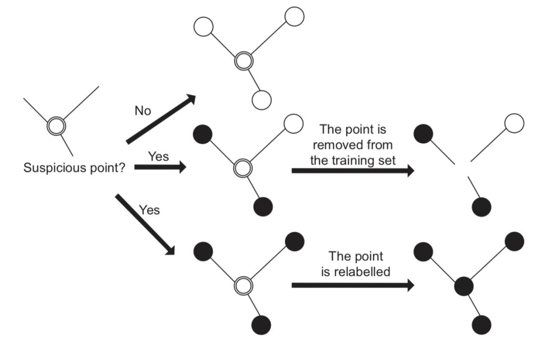 一个典型的场景是在有标签噪声的情况下进行学习 [68]。目前已有很多理论研究 [69-71],其中大多数假定存在随机的分类噪声,即标签受随机噪声影响。在实践中,基本的思想是识别潜在的误分类样本 [72],然后尝试进行修正。例如,数据编辑(data-editing)方法 [73] 构建了相对邻域图(relative neighborhood graph),其中每一个节点对应一个训练样本,而连接两个不同标签的节点的边被称为切边(cut edge)。然后,测量 一个切边的权重统计量,直觉上,如果一个示例连接了太多的切边,则该示例是可疑的。可疑的示例要么被删除,要么被重新标记,如图 6 所示。值得注意的是,这种方法通常依赖于咨询邻域信息;由于当数据很稀疏时,邻域识别将变得更不可靠,因此,在高维特征空间中该方法的可靠性将变弱。