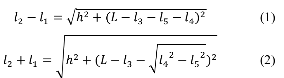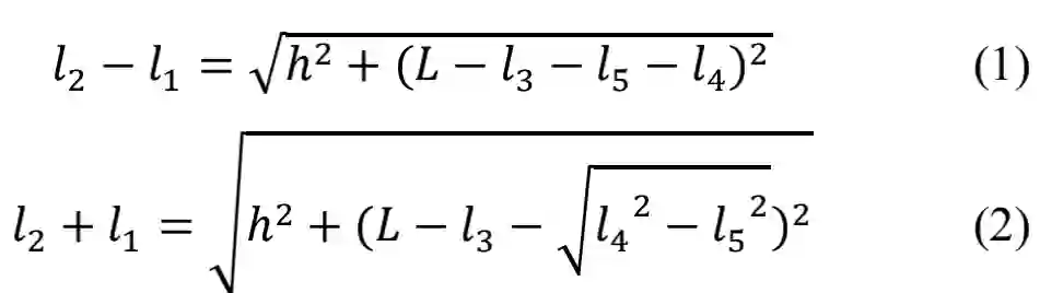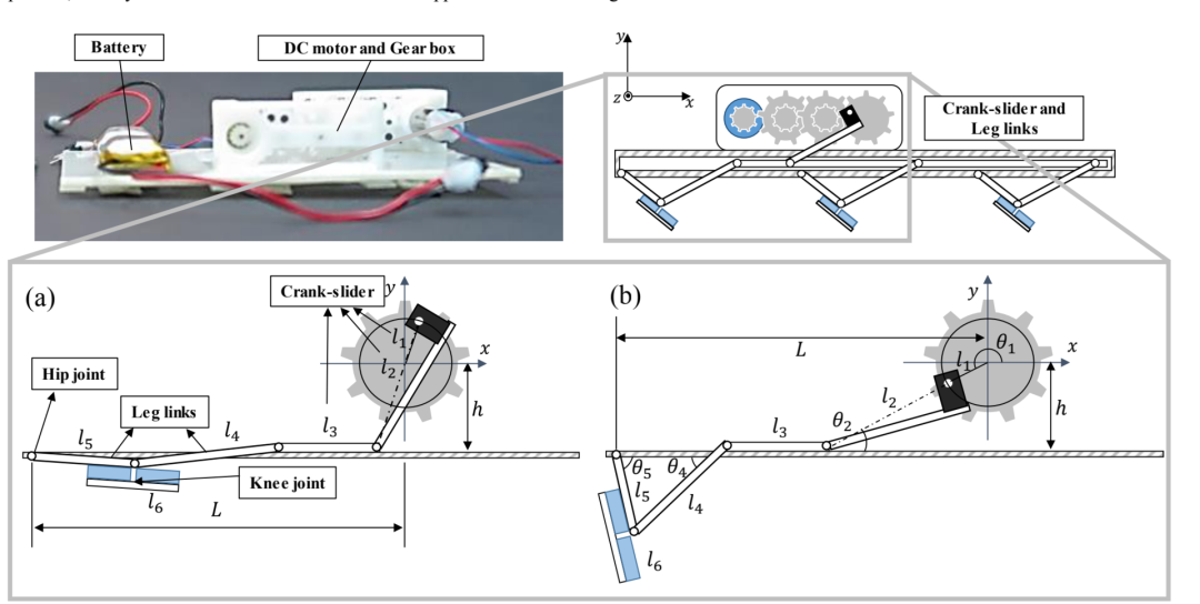 其中变量l1表示曲柄连杆滑块的长度。,l2是连杆长度,l3是滑杆长度,l4、l5是腿部链接装置的高度,h是机体高度,L是输入齿轮和关节之间的长度。