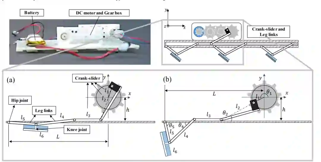 关键设计是由曲柄滑块机构和可伸展收缩的腿部关节与各向异性的着地腿,组成的简化运动链。